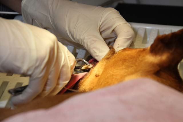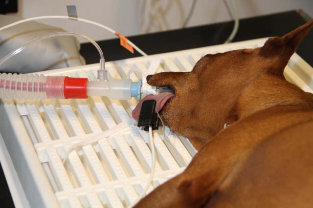 Hunden tilføres narkose og ilt via slangen, og samtidig sørger slangen for, at der ikke løber vand ned i lungerne.